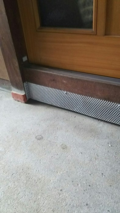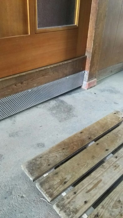 扉の開きが悪く、傾いていたので補強を入れる事にしました。 ついでに、イタチが悪さするみたいなので、アルミのパンチングの板で出入りをふさぎました。 これで安心です。 2016年12月23日(金) 22:59 | カテゴリー:施工実績